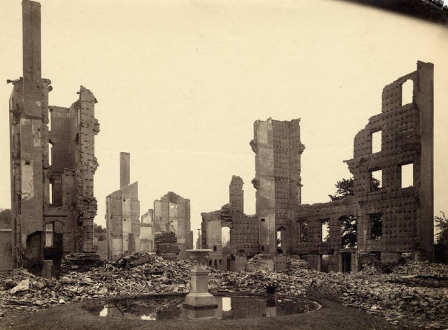 At seven-fifteen. the roof beams and the great center cupola, proudly built in 1860, came crashing down. Then, one by one, the big chimneys tottered and wavered. Each struggled to stay upright, like a drunkard fighting for dignity, but each ultimately fell. Two lurched forward and shattered on the lawn. The others shuddered and collapsed where they stood, telescoping downward into the flames.